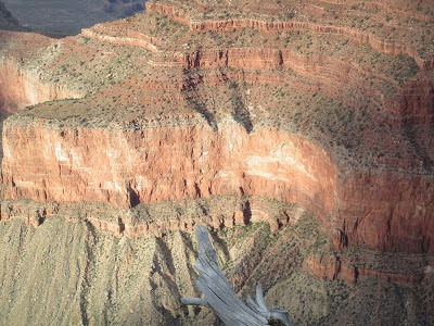 We hike along the rim trail, and up and down the far more challenging Bright Angel Trail until exhaustion claims me, and we take the shuttle bus back. We nap and, on waking, realize we are now in the 'golden hour' before sunset when, as a park ranger told us, the slanted light dazzles the array of color tones in Nature's great portrait of Earth, Rock, and Time that is the canyon wall. Clouds, some of them dark, cover the western sky, so we're not expecting much. But then we see gaps in the clouds permit arrows of radiance to pick out and illuminate segments of canyon wall. Camera in hand this time, I snap and snap and snap.
