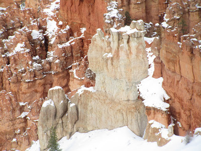 light snow begins falling shortly after we arrive at our lodging, which at first I regard as a great novelty – 'Gee,' I think, 'remember seeing snowflakes at Bryce at the end of May...' Snow grows stronger; next time I look the evergreen shrubs outside our window are showing that scenic wintry look. By morning six to eight inches have fallen, and slogging is hard on the park's open trails. Apparently most of the park is closed. The central ‘amphitheatre,’ however, where the views are stunning, is open to visitors. We drive to Sunset Point and join hundreds of variously dressed visitors picking their way along paths already turned to slush. The views at the outlook points are misted. We take the shuttle bus to Bryce Point, the crown of creation in this conspicuously showy park and find, with hundreds of others, that the view is almost all snow-fogged in. Half an hour ago, someone says, you could see everything. We go back to our lodging. In the late afternoon, however, when we return to the park the veil of mist has been removed and the view is clear to a horizon many miles away. The "hoodoos," the term given to these oddly humanoid figures of rounded red-stone columns (wearing their little snowcaps) line up for inspection.