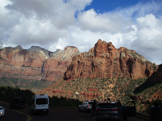 We get up and drive to the ‘east’ entrance through the 'famous' -- at least to park groupies -- ‘tunnel’ of switch backs and heavy traffic, cars pulling off the road wherever there’s any hint of space to gawk at the high walls, and cliffs, and multi-colored towers all round us, the road hair-pinning so frequently I'm afraid to take my eyes it to take in the truly astonishing mountain scenery through which mankind has chiseled this dramatic pass through god's damnedest country: these pinnacles, pyramids, domes, temples, cathedrals and fortresses of eroded rock -- as the painter who first shared them to the world at the St. Louis world fair (more than a century ago) most eloquently described them to a disbelieving public, saying in effect "you can't make this stuff up." I'm glad we went to see these miracles of time and mineral nature for ourselves. They are all really there.