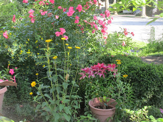 Too much is going on. I like it that way. I am a player in the arrangement of species here, but not a dictator. I don't have the time, or taste for that kind of role. This is a living kingdom. When the orange daylilies jump over to a place near the white fence that once was occupied by what -- I don't think I remember: all various plants species are all simply playing by the same rules. Blossom, flower, send forth your seed. Go forth and multiply.