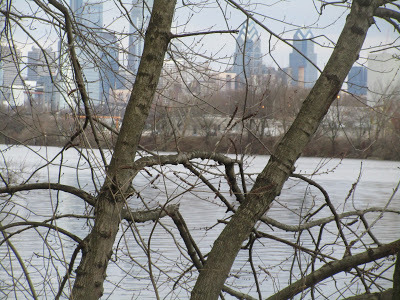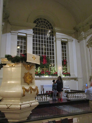 Called Carpenters' Hall, it's the site of the First Continental Congress. It took place in 1774, a time -- our volunteer told us -- when the delegates were looking for ways to temper their dispute with British authorities. They penned a long list of grievances, and hoped for what today we would call "a dialogue" on how to repair relations between the colonies and the 'mother country' and removed some of the causes of a rift that threatened to grow larger. Under the belief that the King was sympathetic to their position, and that the biggest problems stemmed from acts of Parliament, they sent the petition directly to him. But the king simply ignored their petition, and did not reply. Carpenters Hall, we learned, originally a meeting place for the Carpenters Guild, was also leased for other uses. Benjamin Franklin used space there to set up the first American post office, the first lending library, and first 'fire insurance' incorporation so that neighbors could help one another after a serious loss of property from fire and know that they would receive help in turn if it happened to them. When the Second Continental Congress convened in 1775, again in Philadelphia, they met in the larger building now called Independence Hall. Relations between the colonies and Great Britain during this time, especially in Boston, where the port was closed and the city occupied by armed soldiers. By the time the delegates finally took a vote on independence, acts of war had already taken place: the battles of Lexington and Concord, and then the bloodbath of Bunker Hill. I would have been happy to discuss these points with the two cops in the front of that hall in a civil war, but they simply wanted to make the problem (Mr. Public me) go away. The Carpenters Hall guide also suggested a few historical attractions to us that would be open, including the Museum of the American Revolution (which we didn't make) and the historic Christ Episcopal Church (more about that below). My advice is to the inquiring tourist. Always talk to the guides, volunteer or not. They know stuff. And don't bother with the uniformed, weaponized arms of the State. they don't know shit. We three celebrants declared our own independence from our previous family custom that evening by acquiring a modestly sized Christmas tree at the little corner lot, carrying it on foot with a two-person carriage-technique back to Sonya's apartment, and inserting it into the stand. We trimmed it that evening with an interesting red and white motif consisting of stringed popcorn garlands and a box of copious and variously patterned red balls, plus and a few oddballs such as the orangey-tan "matzoh ball." The next day we visited the nation's oldest surviving botanical garden, Bartram's Garden, located on the banks of the Delaware River, and offering a good view of the city skyline (photo above). A famous botanist named John Bartram founded it in 1728. A National Historic Landmark, the garden is looked after by the John Bartram Association today. Which means, of course, you can get married there. The site includes some lovely old buildings, closed naturally for winter, some planting grounds where hardy herbs and vegetables were still growing -- the cabbage and cauliflower family plants were still green; and Sonya found a single flowering pansy-- and also a medicinal garden of healing plants, a boardwalk trail that takes you down to the riverside, and specimen trees including (according to a sign) the oldest ginkgo tree, an Asian import, in America. It was fun to prowl around there and walk the trails in the dead of winter, and the place must be amazing in summer.