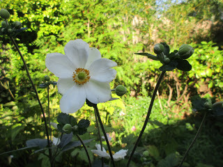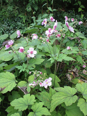 August is late summer. One of the flower garden's annual treats is the arrival of the fall-blooming anemones (top photo). Which, I am informed by the website Gardenia are also known as Japanese anemones and "windflower." Actually I recall the latter name from the garden centers where I purchased a few. These August-flowering plants are native to China, and have been cultivated by the Japanese for centuries. A special benefit is their long blooming season, six to eight weeks. The meter on our first bloomers has been running for about three weeks. We grow three different cultivars. The light pink, dark-centered one, blooming now. An all-white flowering plant. And some plants with a darker pink flower, that generally carry us into October.