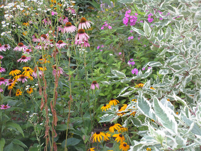 spends most of its blooms on the higher branches where the light is best. It's also been forced to grow high to escape the clutches of its very close neighbor, a Korean lilac whose steady expansion is leaning into taller plant's personal space. I like watching how the plants adapt to one another.The third photo down pictures a low-growing dogwood with two-toned leaves. The bloomers in this photo are the dark pink tall phlox, the Black-Eyed Susan, and the light pink cone flowers. All of these started blooming in July and continue through this month.