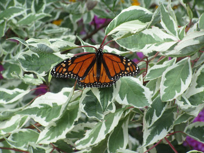 One of this season's most regal visitors is the Monarch butterfly, lord of all he sees, at least in my opinion. We saw him for weeks darting through the neighborhood's backyards. Our neighbor across the street has a row of marvelous butterfly bushes (Buddliea). He also darted, at great speed and in constant motion, through our gardens, front and back of the house, and I lay in wait with the camera, hoping to catch him napping. Basically, as I discovered, butterflies don't nap. I finally caught him catching a breather on the Dogwood.