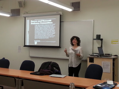 Building on the Felicani collection and other sources, Professor Michele Fazio of the University of North Carolina at Pembroke also spoke at the commemoration, sharing slides and stories of her research into the lives of the principals and the impact of their case on their Italian birthplace communities, in a talk entitled "Mining the Archives: In the lives of Sacco and Vanzetti." She traveled to each man's birthplace, Sacco's in the town of Torremaggiore in the south of Italy; Vanzetti's in Villafalletto in the northwest region of the Piemonte. She pointed out that the case and its victims are well remembered in Italy, while they are largely forgotten by the American public. In fact, family memories of both men evoke strong emotions. A traditional memorial plaque in the cemetery at Villfaletto preserves the memory of a famous native son whose death symbolized the continuing oppression of the poor and the working class. In Torremaggiore, a memorial executed in a modern looking vertical column remembers Sacco's life. Locals in both communities extended a remarkable degree of hospitality on her visit, Fazio said. "You have to eat first, and then you can talk. She also showed slides of newspaper coverage of the ongoing story in America, including frequent depictions of Rosa Sacco, the defendant's wife and mother of his children, to illustrate the personal side and family impact of the case. Later the newspapers ran photos of Vanzetti's sister, Luigia, who arrived for a last meeting with her brother just days before his execution.