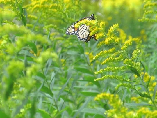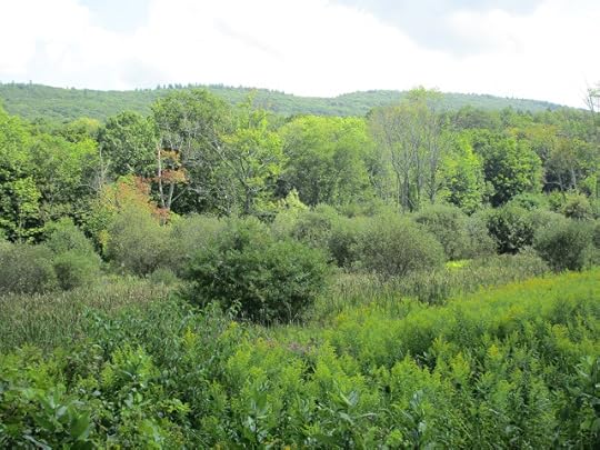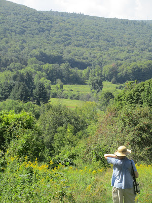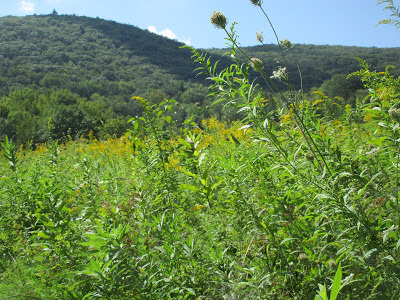 This time, on Labor Day, a day that turned unseasonably warm, we followed directions from a Berkshire County hiking guide through Great Barrington to Egremont, then down a smaller road to the state forest, turning off at one of those old mud-brown state park signs that told us we were entering a 'management area.' Just a quarter minute later we see a sign for Jug End -- it keeps a low public profile -- described as a 'State Reservation.' A free, no-hassle, modest parking area greets arrivals. The place looks well taken care of. Our hiking guide praises Jug End's trails for offering "some of the best views in the Berkshires." And, the bonus for us, you don't have to climb up a steep trail to reach them. The trail we take is a very satisfying loop marked with blue blazes. We find open fields or meadows, left wild and yet somehow managed to keep the trees from making inroads. Maybe they cut it every year in the spring. It's in full bloom now. Wild meadows in September are a delight. Many wild plants like Queen Anne's Lace are still blooming, spilling all over one another and mixing with asters and other late bloomers. Some, like the Goldenrod pictured above, are just reaching their peak. Butterflies are all over the meadows as well. We pass through two fields, according to the guide, but it seems like more because of the trail loop, or the choices we make while walking along soft pathways of recently mowed wild grasses. Someone, as I said, is keeping the place neat and pretty.