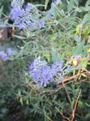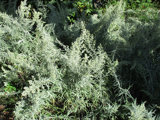 Back to the perennials. The Artemisia, which grows thick silver-gray foliage, and spreads everywhere, reaches its peak this month, when it flowers tiny, whitish buds at the ends of all its its branches and twigs. I call 'bud' because they are rounded and closed in appearance, but they never open, creating a two-toned effect on the silvery foliage.
