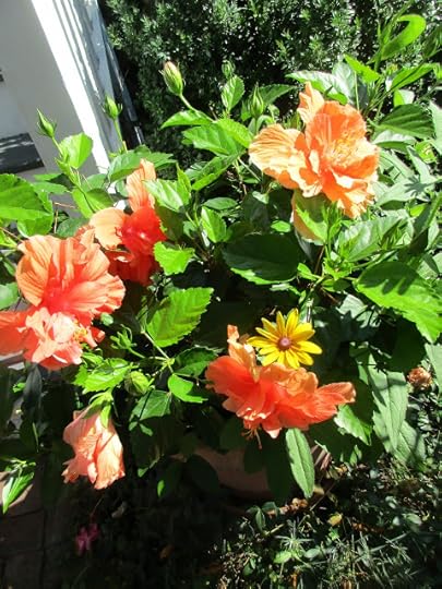 Annuals, especially plants whose true home lies considerably to the south, can be very rewarding in September. We have pots of various sorts of Hibiscus, the 'annual' variety in this latitude. Plans with blooms very similar to these, if not exactly the same grow all year in subtropical climates such as Florida. The orange blossoms at the left dress up the house front.