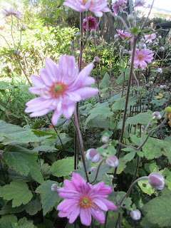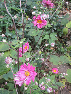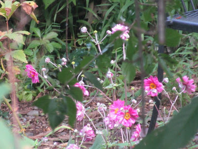 Lots of anemones of the late-blooming species bloom this month. The dark pink flowering variety are blooming now. They follow a lighter pink flower that mostly had its run last month. A third variety, producing white, chalice-like flowers, pictured below the dark pink ones, are just beginning to open now. I wait for these perennials every year, and they never let me down. Some of these plants are sold under the commercial name of "wind flower."