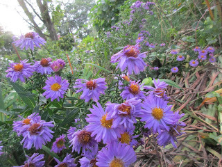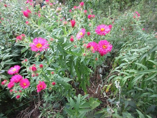 Add caption The last photo on this page shows the tall red Aster, quickly growing so tall and leggy that I will have to stake it soon. Bees love these late-blooming flowers. One of them followed us into the house this evening after we went out to visit the plant, and promptly lost himself.What are the odds that I discover him someplace really inconvenient?