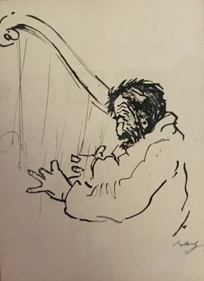 Among the fine offerings in the September issue of Verse-Virtual, an elegant "ekphrastic" poem -- the term used for poems that respond to pictures -- by Steve Klepetar illuminates the truth of the image. His poem "The Harp Player" matches the style of its minimalist subject -- the image of a haggard, but devoted figure pursuing an ethereal art -- with the well chosen words of his 14 short lines.