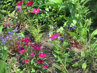 Lamium, or "spotted dead nettle," proved to be one of the year's best recovery projects. After I weeded everything else out of its designated patch, back beside the Goat's Beard and underneath the Japanese maple, the plant spread its two-toned leaves and held up its pink flowers in more abundance than I've noted in previous summers. Abetted by a selection of annuals (and, yes, a lot more weeding), a colorful patch in the back of the garden with midday sun. (esp in June when the sun's high). Here are the dark pink Dianthus, a few Cosmos with similarly tinted blooms, and blue Lobelia.