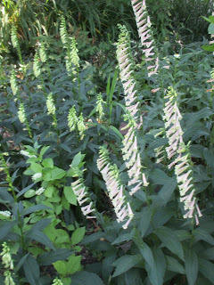 Another plant with a nice color contrast is the coral bell (seventh down), with delicate pink flowers above dark purplish-green leaves. Again, it's highly recommended as flowering perennial that blooms without too much sun. Most of all the plants growing here in our the back garden are labeled semi-shade. That's a cleome blooming in the lower right of this pic.