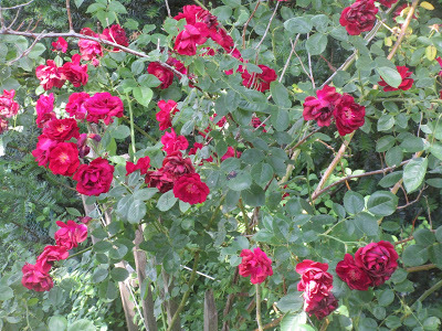 Deep red blossoms from a traditional rose vine are blooming strongly this year. We found two of these vines straggling through the years when we moved in. After some pruning and fertilizing they have been pushing out classic roses every year.