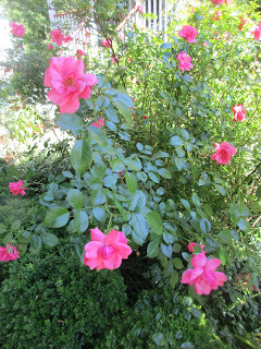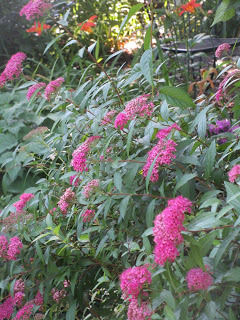 This Spirea (fourth down) blooms in a lovely dark pink to reddish color. Somehow they never last -- but you've just heard that story. However, if you conscientiously dead-head all the faded blooms, you may be rewarded with a good second show. That's my job for today.