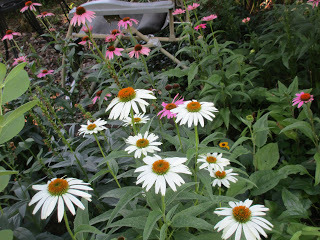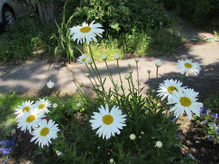 The roses pictured beneath the lilies are a contemporary "knockout" cultivar. This photo was taken early in the month. The blossoms have ten-tupled since. Our neighbor has about six of these plants, all of them ferocious with color. The white Shasta daisies go back to one of our earliest plantings. I transplanted them all over. This group grows on a bit of soil we call the "sidewalk strip, turning up those happy faces to the garbage men and other passing traffic. I wish they would bloom all summer, but I'm unable to get a second bloom from them even after assiduously dead-heading