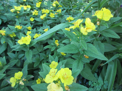 Next down are the yellow flowers of the evening primrose. This plant came from my mother, via my sister Gwen. A strong June bloomer, that spreads itself all over creation, even blooming in some mostly-shade areas such as here, under a big maple.