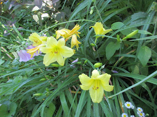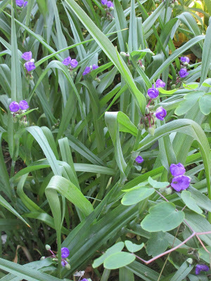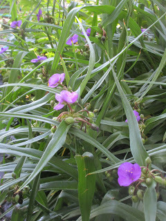 Spiderwort (second photo down) move in anywhere you let them. When they all bloom at once, on a dark morning or in blazing sunshine (doesn't seem to matter) they can be stunning. When they start to tire and the weather gets dry, they just flop all over the place. Now the question is whether to try put up with them in hopes of later bloom, or cut them down. I do a little of both.