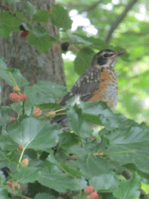 In the next photo, we see the lower branches of the fruit-bearing mulberry tree, that provides evident reason for this bird's continuing presence. Others too, of course. Including a male cardinal yesterday. The best reason for having a tree that drops these messy berries all month is the level of chirping and calling that sometimes persists for whole sunny hours or longer on beautiful afternoons this month.