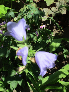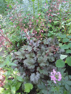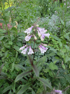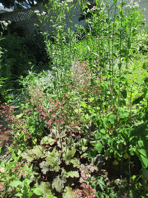 Lots going on in the plant world as well this month, of course. The plant called the purple Penstemon, which I planted in one place years ago, has divided itself in half and now shows up in two places. I saw a bunch of these living large in full sun in a friend's front yard. That's what they like. This spot in our garden is definitely part-shade. Coral bells (at left). Too much sun when I took this photo to see the purplish stripes in the plant's dark green leaves. This light also washes out the color in the plant's delicate flowers.