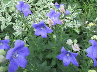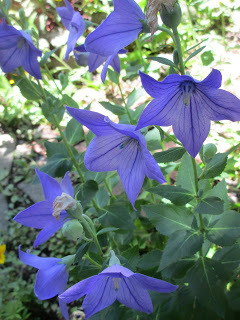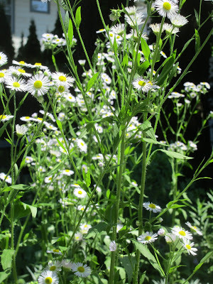 A mid-sized Bell Flower, species name "Campanula," sends up a few blossoms in our part-sun, part-shade back garden. The daisies or asters in the next photo down, I'm not sure what they are, send up tall slender stems. When all the blossoms open at once in late June, it makes the show we see here. It may be Fleabane, an American wildflower.