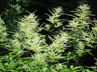 Astilbe, blooming red and white in the third photo down, are going good in early July. A plant widely recommended for shady spots. they're surviving here where it's shady more than half the time; but the high sun of late June and early July stays on them for a longer piece of the day. If only these blooms would last all summer -- that's what we say about most perennials.