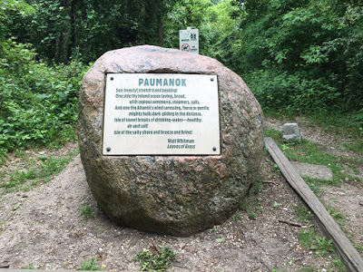 Walt Whitman called it the highest point on Long Island, which it is, and spoke of its marvelous water views, a perspective nolonger available because the trees have grown up on all the low, rambling hills in this lovely spot now known as West Hills County Park.The poet who was born nearby, described a "view of thirty or forty, or even fifty or more miles, especially to the east and south and southwest: the Atlantic Ocean to the latter points in the distance - a glimpse or so of Long Island Sound to the north." We walked in West Hills for the first time ever on a lovely Saturday in June, the day of our niece Emily Knox's wedding. With a few hours to go before church time, we looked for some place near our Huntington motel to take a good walk. This wooded county park was it. Given the beautiful dry weather, we must have lucked into one of the best days of the year to hike in these gentle hills. The date was about a week before the Summer Solstice, and we found the wooded trail awash in mountain laurel in full bloom. The summit is marked by a boulder bearing a plaque inscribed with a reference to Walt Whitman's "Starting From Paumanok," a long autobiographical poem titled after the Indian name for Long Island. The poem appeared in the first edition of "Leaves of Grass." The Walt Whitman Birthplace, located at 246 Old Walt Whitman Road in Huntington Station, is a Federalist style farm house once owned by a family with roots in this part of Long Island dating back to the 17th century. While Walt's father moved the family to Brooklyn in his son's childhood, family connections brought the poet back to this part of Long Island frequently Generally regarded as America's greatest poet, and the most influential worldwide, Whitman became known as the poet of democracy. In an introductory essay to a comprehensive volume of the famous work, "Leaves of Grass," scholar Sculley Bradley pointed out that democracy for Whitman meant more than counting the votes. The poet regarded democracy "as the order of nature. It embraced every conceivable condition of life for mankind. Its essence was love, extending in universal justice around the world." For me, this conception of a mundane and what has become an almost meaningless word, Whitman's idea of democracy sounds like a humanistic interpretation of the theory of evolution. Whitman believed that democracy was moving purposively forward, despite all of humanity's flaws, toward an end Whitman called "amelioration," a term philosophers in his time used to mean "things are getting better" or at least less gruelingly bad. Age by age, Walt Whitman believed, human beings were working the kinks out of their society. Whitman was hardly blind to the imperfections of rowdy, self-serving 19th century America. A big city newspaper editor in New York (and, briefly, New Orleans), he witnessed political corruption, poverty, and bigotry. A volunteer nurse during the Civil War (wounds dresser, essentially) in a medically brutal time, he provided companionship and kindness for maimed and dying men. He worked as a civil servant in Washington D.C. to support his volunteer work and writing. In the climate of post Civil War America, a government job gave him a front-row seat on a corrupt era in national politics matched only -- dare I say it? -- by today's open market for purchasing Congressmen spawned by "Citizens United." After Whitman published the first, modestly sized edition of "Leaves of Grass" in 1855, his radically original poetry drew praise from America's reigning intellectual god, Ralph Waldo Emerson. In a famous letter Emerson wrote him, "I hail you at the beginning of a great career, which yet must have had a long foreground somewhere, for such a start." That foreground, Bradley writes in his essay, "was an opulent inheritance of American idealism that could survive the later disillusionments of journalism, the corruption of men, and the catastrophes of war." Sounds like a good summation to me; only I'm not sure journalists these days carry around any illusions to lose. Anne, Sonya and I were happy to find what may be the best nature walk on Long Island, even if we couldn't see scores of miles out to sea. That one of the most thrilling and influential voices in modern literature shared this perspective and on occasion this woodland ramble makes West Hills park especially memorable. "And what I assume you shall assume," Walt Whitman tells us in his great poem "Song of Myself." "For every atom belonging to me as good belongs to you. From which I take it that -- good times or bad -- we're all in this together.
