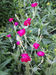 These daylilies (fifth down) have a lovely soft color. They tolerate neglect and crowding as you tell from this photo. And partial sun. I've been trying to collect different varieties of this remarkably versatile plant (though I forget to write down the names) so that the differences in blooming dates will keep the color flowing for over a month at least. The native orange daylilies start in late June. Some other varieties have yet to begin to bloom. The pale yellow ones here are finishing up. Rose Campion (sixth down) is another champion of midsummer, late June to early July. Their dark red flowers (that name them, I suppose) contrast nicely with the gray stems and leaves. I don't know anything more about them, but that's enough for me.