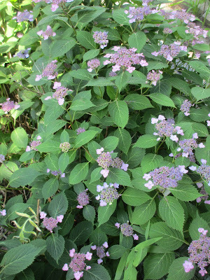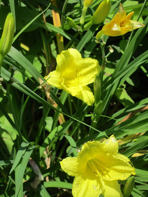 Lamium (sometimes sold as "spotted dead nettle") is shown here (eighth down) growing beside the newly reconstructed stone and gravel path. Everybody does their road work in summer Lace-cap Hydrangea (ninth down) shows in this photo exactly where its name came from. The plant grows expansively, but hard to believe, truly wilts in the sun. In our front garden sun is more prevalent, and in sunny, dry periods (like today) they require watering every day (yes, also on today's to-do list). A different daylily with a darker yellow color is pictured here in the last photo. I love this tint and should have kept that name tag for this cultivar. Remembering the names of plant varieties is one of those activities they recommend for improving your memory. I think I'm going in the wrong direction.