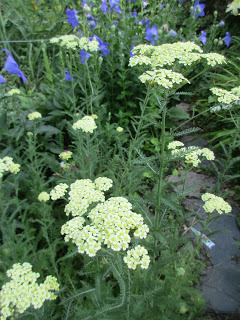 July is the big month for daylilies. After the familiar orange native variety finishes their bloom, cultivars such as the daylilies in the top photo take over the stage. To my shame I gave up trying to keep track of their names years ago. This plant produces blossoms that are big, striking, and numerous. If I had to name it, I might call it 'best seller.' The second photo down is a medium tall, white flowering herb called Achillea or, more commonly, yarrow. Herbs tend to be native plants that are hardy and make the best of the situation.