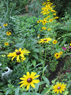The third photo down is Balloon Flower, whose formal moniker (I'm told) is Platycodon grandiflorus. It's grand, all right in July. The 'balloon' name comes from the puffy buds, some of which you can see in this photo. It's their color and prolific quantity of blossoms that make them a winner for me. These happy flowers are shown in a tighter close-up in the page's second-to-last photo. The next photo down shows some of Black-Eyed Susans (Rudbeckia hirta) that proliferate this time of year. I've learned they are a member of the sunflower. We have tow varieties, one (pictured here) blooms a few weeks earlier than the second, which has somewhat darker green leaves and stems and has proved a real land-grabber, well adapted to our part-shade growing condition.