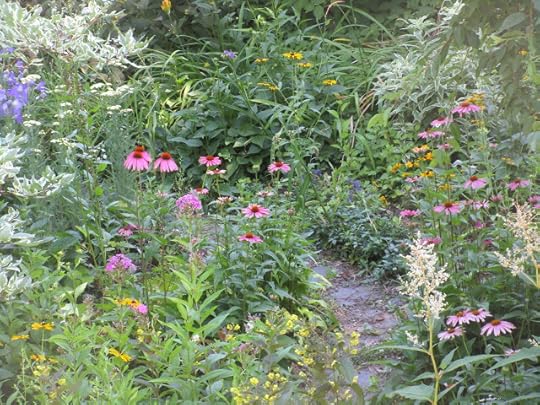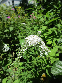 The back piece of garden gets good light on July afternoons. The eighth photo down pictures a high-noon gathering of the some of the perennials named above. The next photo depicts the angle of the so-called "Gooseneck Loosestrife." Another herbaceous perennial, this one from the Lysimachia family, this gang has expanded its territory in recent years.
