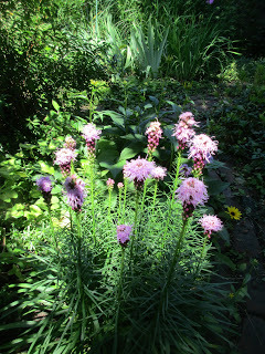 The seventh photo down centers on Liatris, a thistle-like flower growing on tall spikes. Also called Blazing Star, and (a name from an earlier day) Gay flower. Our spikes are not very tall, maybe because the situation gets a lot of shade. It's a another bee-attracter. We get a lot of bees.