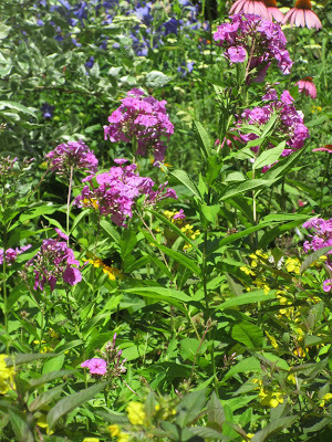 Another shot taken in the high sun hours, the photo to the left centers on the pink-flowering tall phlox (Phlox paniculata), that bloom in July and stay with us all through August. These too eat up a lot of territory and hold on to a lot of color.