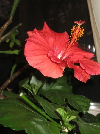 Nights are still long in January, though we've picked up a half hour of daylight since the start of the month. That makes sunsets, lingering twilights, and the evening hush an even more attention-getting time of day than at other times. Inside a warm room we watch the sky turn color, then linger to monitor the fading tones as the darkness deepens. Posed against that twilight (fourth photo down), the red bloom of hibiscus, one of our summer annuals, gets to spend the winter indoor with us. Unfortunately we did not have space for the rest of the garden.
