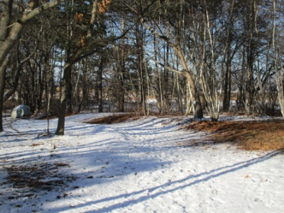 This year so far January has treated us to one full-day rocking blizzard, piling up snow walls on the gutters and hard-shoveling to liberate cars and driveways, in the midst of a wicked cold spell that locked in the accumulation. A week-long gradual meltdown finally reaching bare ground. Then the gentle picturesque minor snowfall pictured in the top three photos here.The fifth photo down shows the first dose of blue sky we experienced after that fall. It wasn't warm enough, and the sun hasn't shined long enough to melt the snow off this path in the thin wood near the Quincy shoreline. But the return of the snow changed the face of the landscape and coaxed me out of the car for the first time in days.