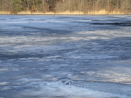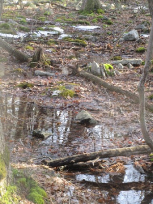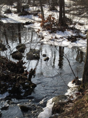 The remains of the snowfall, and its effects, are still evident in the photos that follow. These were taken last weekend in the Blue Hills Reservation, the largest land preserve in the Boston area. It's accessible from Quincy, Milton and a couple other neighboring towns. While most of the footpaths were free of snow cover, some stretches in lower, shadier spots had crunchy, half-frozen tracts. But the big news, in the woodland, was the presence of fast-flowing streams, overflowing at points into wetlands. We saw a couple of green shoots emerging from one of the boggier lowlands -- skunk cabbage, we wondered, already? The sounds of flowing, tumbling brooks provided the music of the winter thaw. It sounded much like the soundtrack to March and April in the New England forests. And we were reminded that "meteorological winter" is more than half over; that begins on Dec. 1 and ends with February.