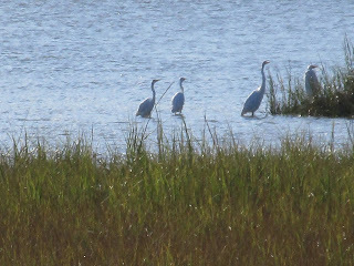 We see many egrets (top right) in Florida, where these wading birds are common. But we also see them in coastal New England, as in the photo here, enjoying a mild autumn afternoon in a salt marsh adjacent to Quincy's Wollaston Beach. Egrets often nest here in the summer; a few winter over along the estuarial waters of the Massachusetts shoreline.