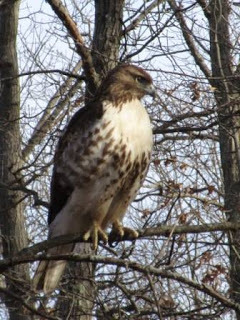 The osprey (seen perching above the nest) is not, to my knowledge, a winter visitor. This photo is from the end of last summer. Still, people build nesting platforms in Quincy and other towns these days to attract breeding pairs, and for the last three years, an osprey pair has found this one. The greatest number of osprey I've seen was in the shoreline preserves of St. Augustine, Florida. I remember being told that the best time to see hawks was during the seasonal migrations. But in recent years I've encountered red-tailed hawks in all seasons. Some winters, though not this one, the encounters occur in the trees above our bird feeder. On one occasion, the "big bird" was simply standing in the middle of our neighbor's grassy lawn, a good perspective on the traffic around our feeder -- or maybe he was just tired. This year we hadn't seen one all winter, until a couple of weeks ago when we found him perched above, but not very high above, a walking trail in a city park. He saw no need to move as we stared for a while, then walked past him on the path. I stopped to take photos from both sides (I think this one was his better).