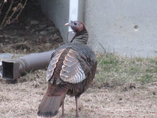 For really big birds, it's best to let them come to you. It's been a couple of years since the turkeys turned up on our street, but when they do it's always an occasion. Here they peck at a neighbor's lawn, looking for gleanings in the bare ground of a mild February week. I won't call it 'unseasonable.' Half of Boston was wearing shorts today.