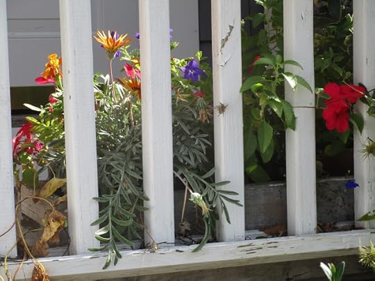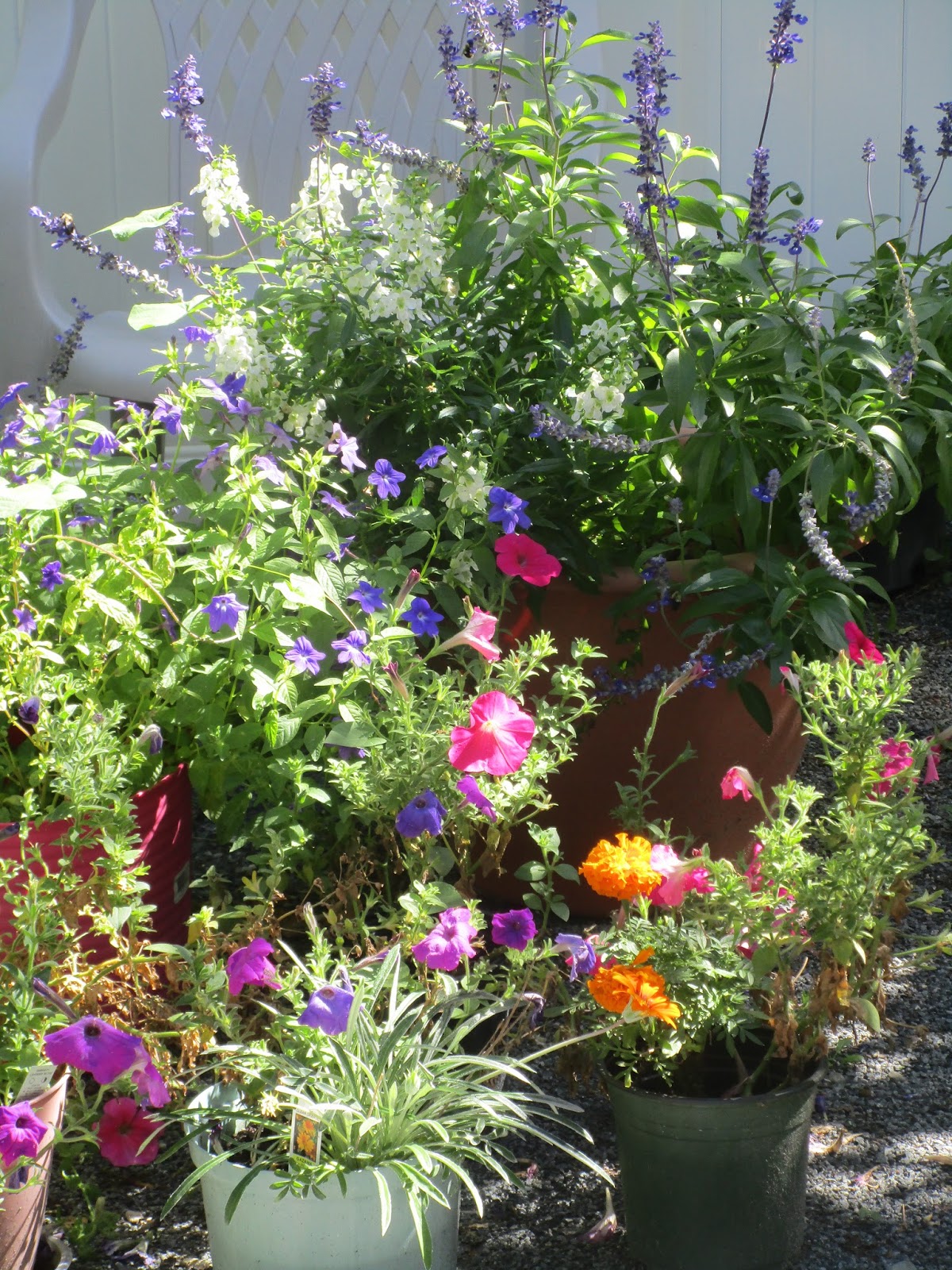 Prominent in this photo are petunias, blue salvia (a very rewarding sun plant), white-flowering Angelonia, some marigolds, verbena, the orange-flowering Gazania, and another purplish-blue plant called unhelpfully 'blue-bells.' Also Lantana (not visible here). I dug some surplus blacked-eyed susans and potted them as well; they flower in July and August, but are pretty much done now. The work here comes in watering them; nature didn't help very much in Massachusetts this summer.