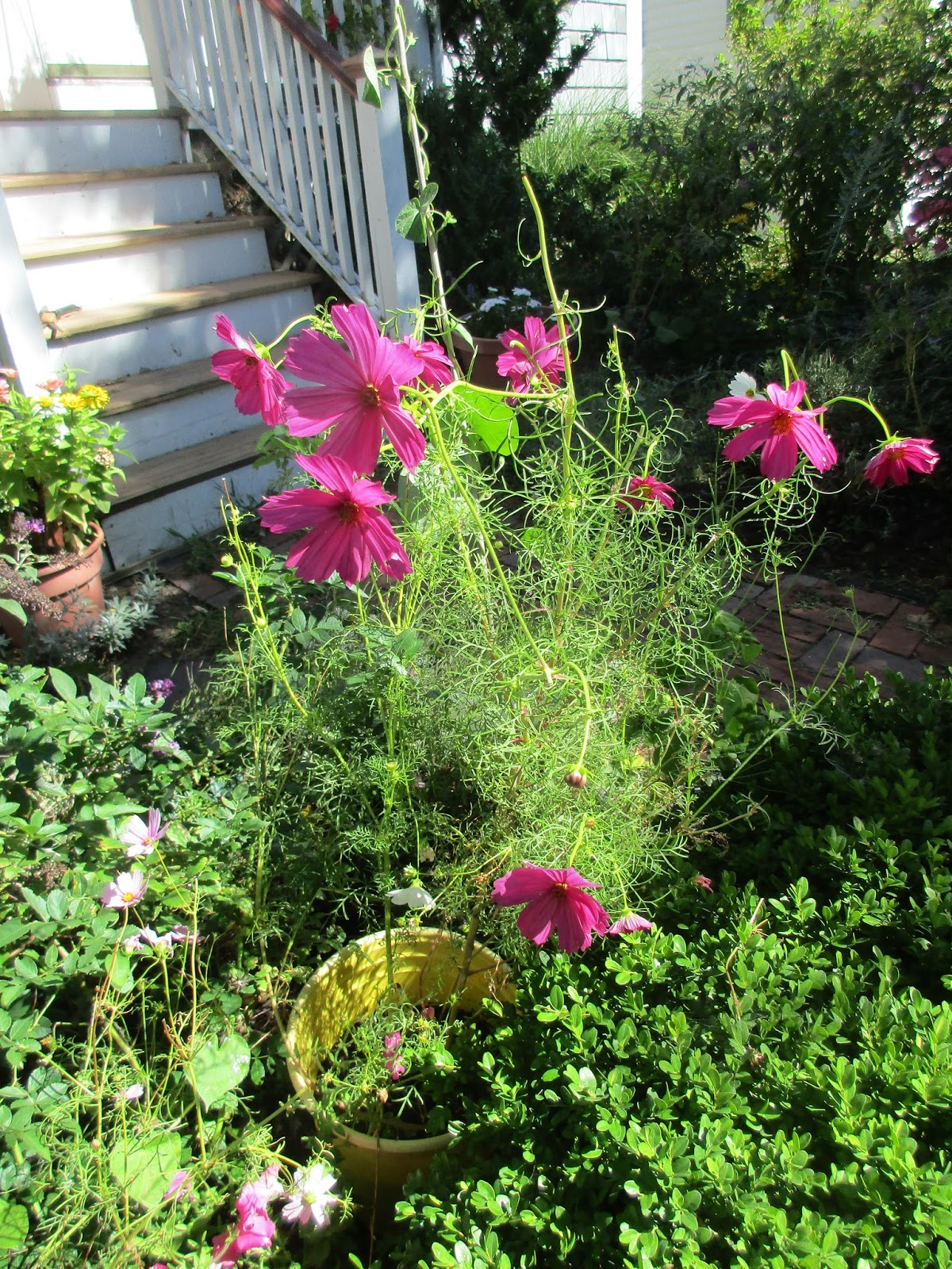 I transplanted the cosmos to wherever I found space for them. Some spaces, naturally, worked better than others. In the photo at left, I potted them so I wouldn't have to disturb the soil below where perennials, bulbs in this case, are already waiting for next spring.