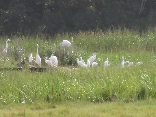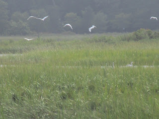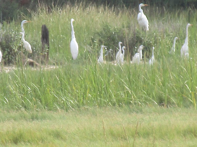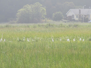 A decade ago, when we fist moved into this part of Quincy close to Wollaston Beach, I occasionally came upon broods of egrets in my walks on the marsh path. I'm told they nest in trees, and no trees are available in the marsh. But judging from their size, most of the birds I saw were first-year waders; yearlings. They clung together, close to their elder out in the thick salt grass (Spartina patens) patches far from the dry footpaths, far beyond where the human beings of our era are likely to pursue. We don't stomp through muddy-channeled marshes even at lowest tide to get our hands on wading birds. I'll bet our ancestors did; probably hunted their eggs too. Those extended family groups stopped taking breaks in the Wollaston marsh, at least on the days I made my scouting expeditions. I began taking photos of egrets and other birds I did see; three or four egrets at once would be high-density days. This year, for whatever reason, I've found egrets in larger numbers on a couple of occasions again. Last week as I rounded the point in my usual marsh-trail progress, I saw the first few birds, lifting their wings and gliding from point A to point B among the flattened grasses. Standing a few feet in front of me an even rare site: a couple of fellow human explorers. I can go a whole year of visits on this path without encountering anybody else on it, so this was a remarkable day. The woman of the pair asked me if I had been on this path before; presumably they hadn't. "Oh, yes." She started to speak, but I interrupted. "Look, egrets!" They looked, I think. But no response. "They're very big birds. They're waders. They migrate here from the South." Kind of nothing to say. I don't know, maybe it was my civic duty to share anything more I knew of this subject with the newbies and worker harder to stimulate interest, but I wasn't getting a lot back. I wished them a good day and kept going around the point, and my view opened on the first dense -- 'flock' doesn't seem right; encampment is more like it -- of Great Egrets taking a migration break in our salt marsh. Wow. Lots of egrets. Out comes the camera. I've worried that my avidity for taking their picture has discouraged large bird presence from our marsh. They'd rather not be the objects of my attention. They'll remember my intrusion and choose another marsh next time. So I try not to take too many photos of the same bird, or group. But this was ridiculous. I looked back at the couple of first-time visitors, but I couldn't tell if the bird show had attracted their attention. Then I saw the strangest thing I've ever seen in this place. A diminutive man (man's clothing at least) emerged from somewhere, walked determinedly past me, perhaps not noticing me, wearing a cloth hat and cape-like smock and carrying a camera; strode right into the marsh (where I was sure no two-legs would ever venture); and headed toward the Egret camp-in. Recovering from my surprise, I walked along my path to get a better view of his intentions, and opened a panorama on a second large multi-generational grouping of egrets. I've seen more big birds in one place before. But that place was Florida. We're lucky to have egrets and herons and hawks up here. They're summer people. We're fortunate to still possess the habitats that attract them for breeding season. Little coastal wildernesses. Micro-habitats that we somehow haven't polluted, drained, or otherwise over-used in our dense domination of the planet beyond their value for other lifeforms. I looked back at the first group of birds and spotted the little man in earth-toned clothes setting up a tripod, shielded by some tall grass (Spartina alterniflora) presumably to take some shots of the egrets at rest or play or work in our marsh.