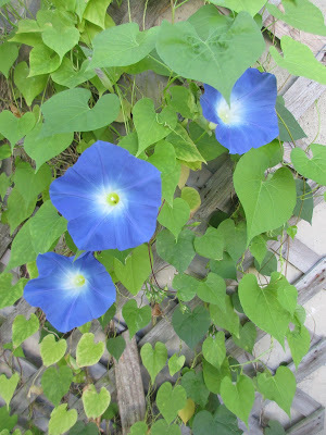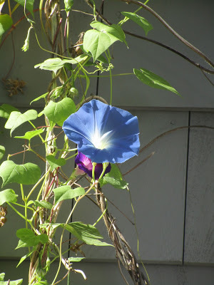 The next, the fifth photo down, is the morning glory, another sun-loving annual that I am planting behind the house in a place convenient for climbing but which does not get full sun. The blooms don't come until late summer.