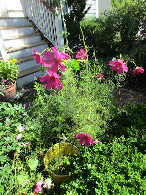 In the top photo, at left, the cosmos I planted by seed in a seedbed out back sometime not too early in the summer are flourishing now. Somehow I never get around to starting seeds early. All the advice givers have you starting these seeds indoors, in a greenhouse, or a cold frame; soaking the seed in the water, or on paper towels, and otherwise acting as if the fate of the entire summer depends on your doing everything perfectly. Or, you can toss them into the ground when the soil has warmed up; forget about them; and then walk by some time in July and say, 'Oh, look, cosmos.'