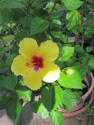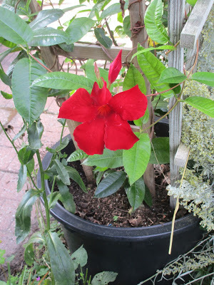 The third photo down is the yellow hibiscus. This color blossom is a great variety for this plant. This particular specimen spent the winter (not too happily) indoors and took pretty much until the end of August before blooming regularly. The next plant down is the red-flowering Mandeville rose, another popular hibiscus that will bloom until the frost.