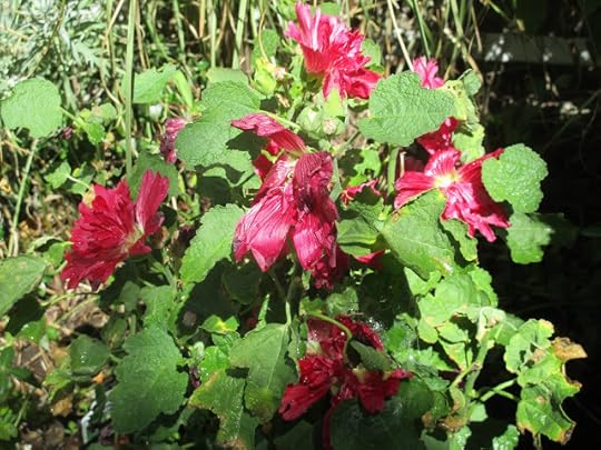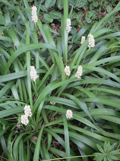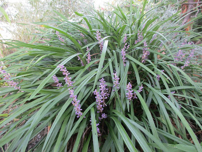 With this Hollyhock, at top, the waiting has just begun. I bought and planted it in August, so we'll have to wait until next year to see if the plant develops those long flower spikes the plant is known for. They are rumored to grow as high as nine feet tall, and varieties with red flowers are said to attract butterflies and even hummingbirds. And I have noticed some attention from the bees, who come to visit us, in considerable numbers, every day. Given this year's far from ideal conditions, I am glad the plant is still with us. The next plant down is a Liriope, a plant I've grown fond of because it blossoms in August, when not a lot of other perennials do. Here's a description from the Missouri Botanical Garden: