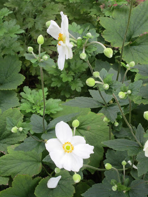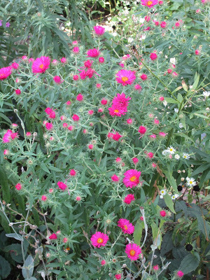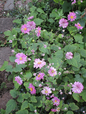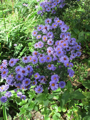 "Easily grown in average, medium, well-drained soils in full sun to part shade. Prefers moist, fertile soils in part shade. Tolerates wide range of light." It's that tolerance I'm particularly fond of. I've grown them in shady spots, and less shady spots, in both the side of the house and the back of the house gardens. They grow fuller every year, put up with competition from groundcovers like Vinca Minor and are not particularly aggressive. A second Liriope with white flowers is shown below.The next two photos are the late-blooming anemone plants. The anemone with a delicate light pink blossom started in late July this year and is no longer in flower. The dark pink blossoms (below, left), shown here have been my favorite September performer for several years. They're just peaking now. I don't remember the white-flower variety (above) blossoming so late in the past. I'll enjoy seeing it in October. I have two examples of asters too. One, with red flowers, grows much taller. The purple flowered plant grows thick and stays low. Asters are regarded as full sun plants, but they have grown and blossomed well for us in partial shade conditions. The bees, contending with a low-rain summer, which robbed some flowers of their usual supply of nectar, have declared themselves much enamored of these end of summer plant, particularly the red-flowering plant.