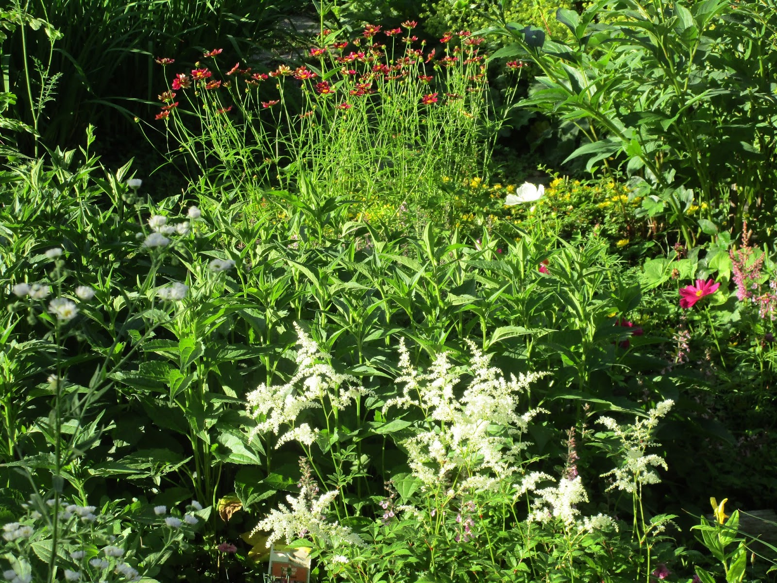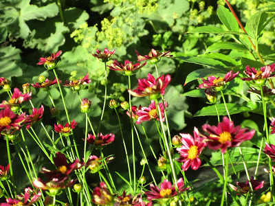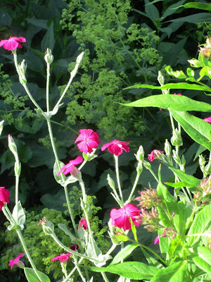 The third photo down puts the white-flowering Astilbe in the foreground and the red-flowering Coreopsis in the back. The red Coreopsis are placed in the foreground in the fourth photo down. You can see their yellow centers. Yellow is the more common flower color for this plant, but the red color in this variety is strong and provides a good contrast to all the green foliage and and yellow blossoms. Rose Campion, dark-pink blossoms against gray foliage are pictured next. The background is Lady's Mantle, with its milky yellow foliage.