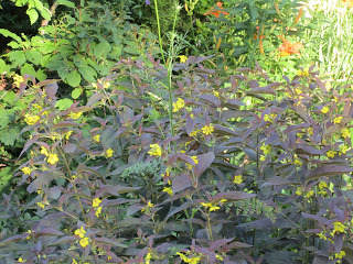The plant with dark purple-brown leaves and yellow flowers is called yellow loosestrife (Lysimachia vulgaris). It grows aggressively. I love the contrast of its dark foliage to all the lighter shades of summer, but it's facing a major thinning this year before it "out competes" all its neighbors into non-existence.